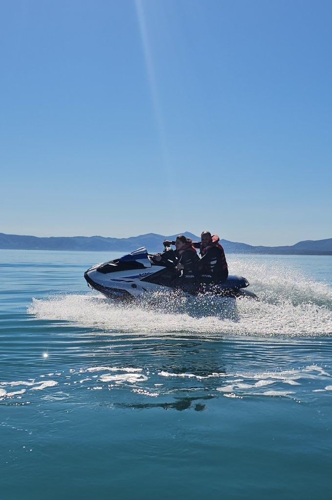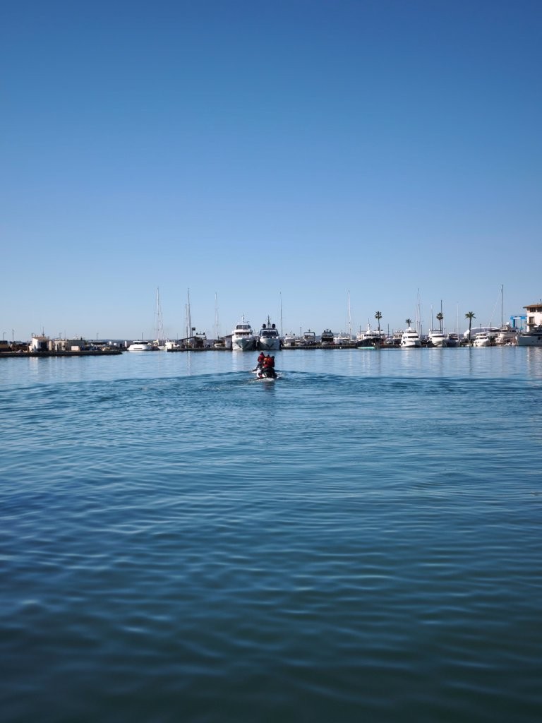 Nous voilà prêts. Nous enfourchons nos jets-skis, et avec quelques minutes d’avance, nous traversons le port à vitesse réduite, guidés par Sam. Pour nous, l’expérience est une première.