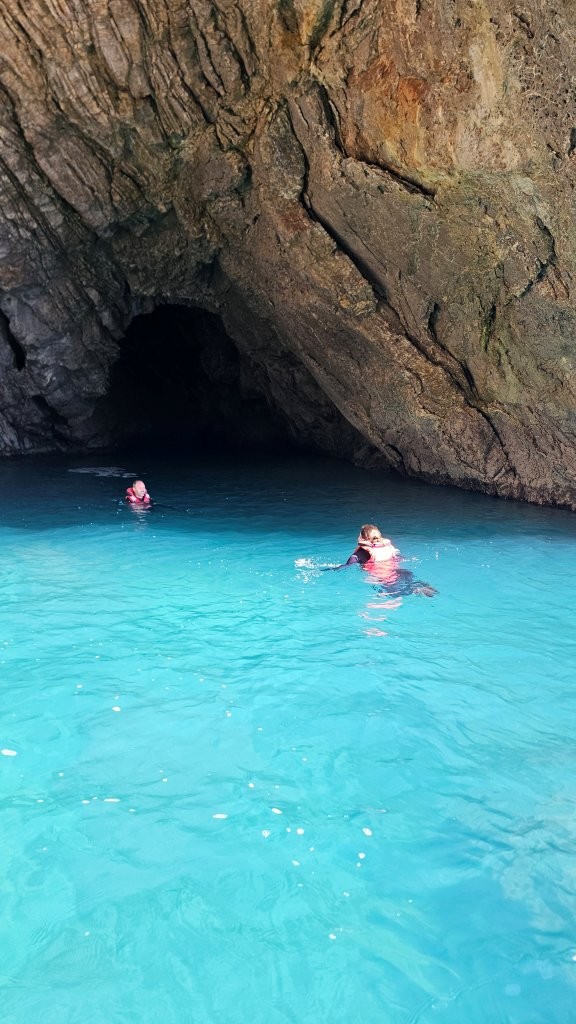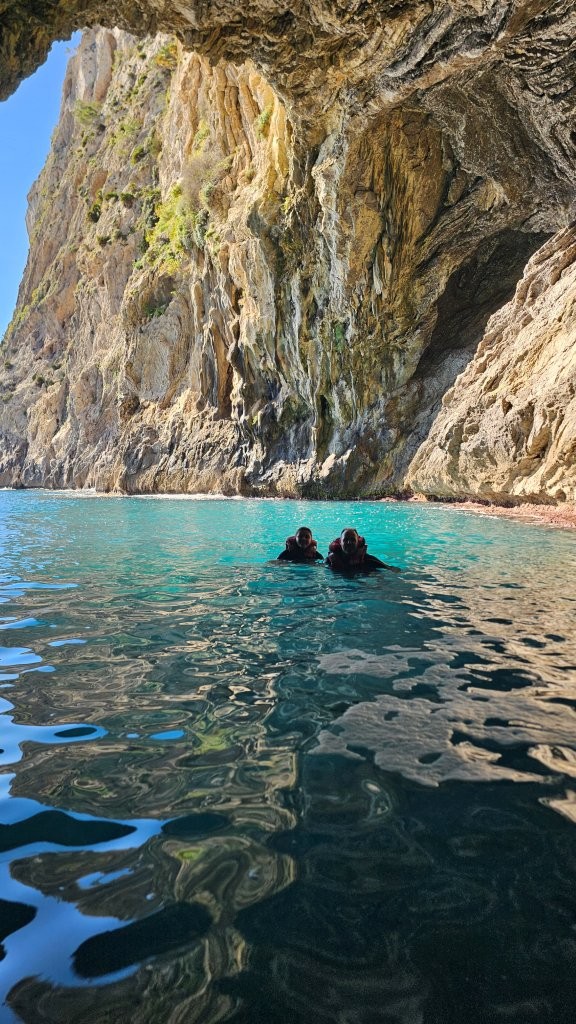 L’eau est fraîche… il faut se lancer rapidement pour ne pas hésiter trop longtemps. Une fois dans l’eau, nous nageons pour nous réchauffer, explorons les rochers, observons les fonds marins et profitons de la vue sur la baie depuis l’intérieur de la grotte.